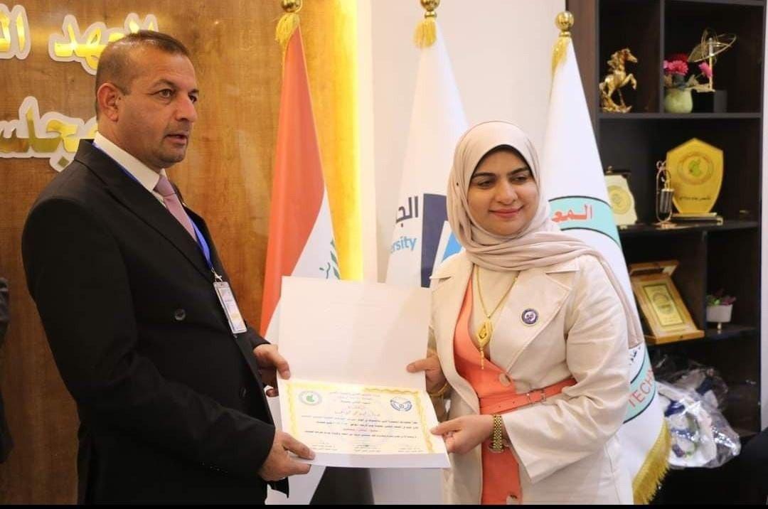 Dr. Najwa Mohammed Jameel Ali, a faculty member in the College of Science, received the gold medal at the Third Applied Conference and Exhibition for Patents, organized by the Middle Technical University. The event, held in collaboration with the Technical Institute in Baqubah, featured wide participation from inventors across Iraq.