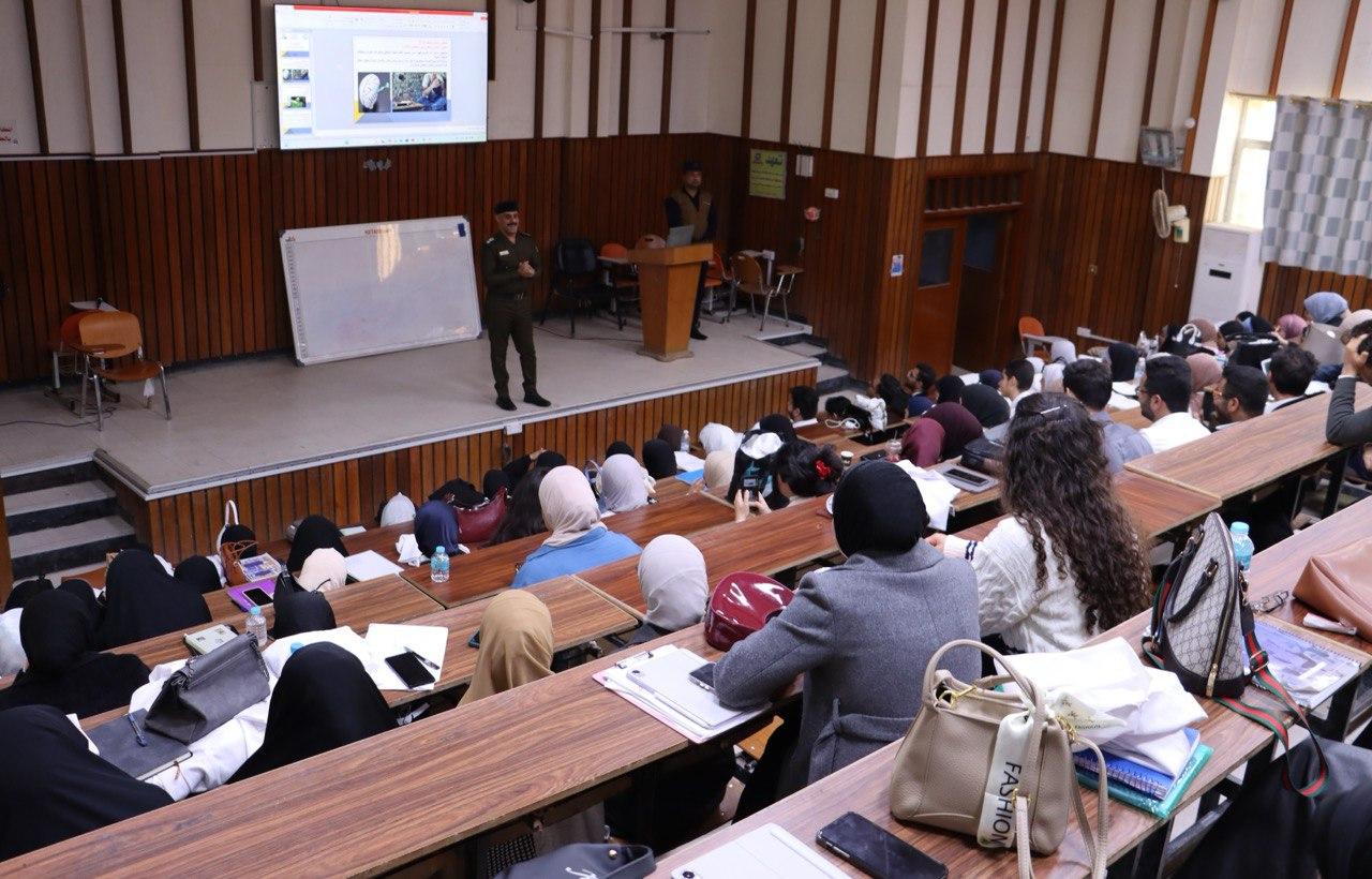 The seminar, presented by Lieutenant Colonel Montadhar Kazem Nima from the Community Police, aimed at raising awareness among the college students about the dangers of this serious scourge that devastates individuals and, consequently, negatively affects families and the community as a whole.