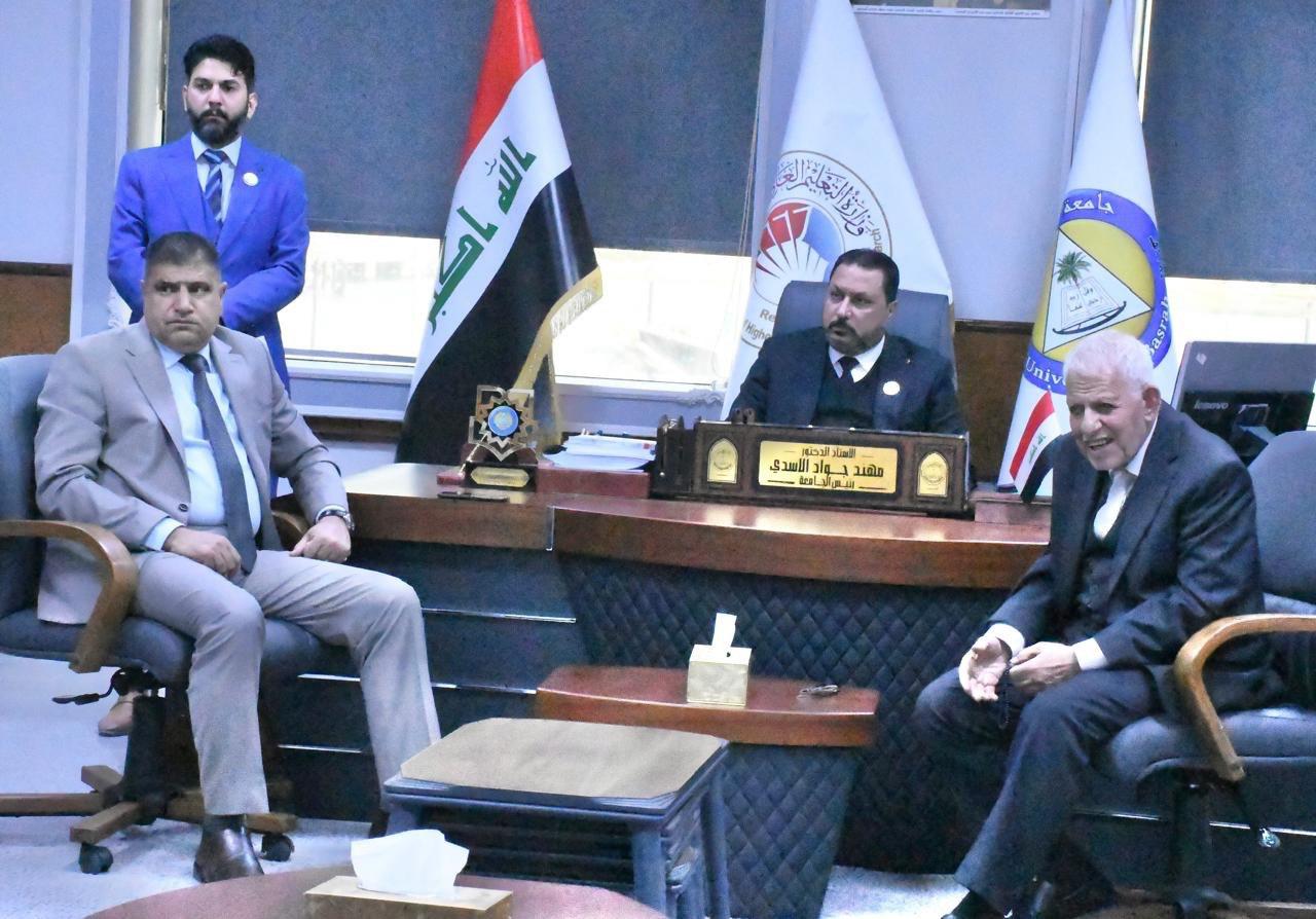 The President of the University of Basrah, Dr. Muhannad Jawad Kazem, received the Advisor to the Presidency of the Council of Ministers, Dr. Hamid Al-Bahili, and the accompanying delegation in the presence of the Dean of the College of Science and the College of Education for Pure Sciences.