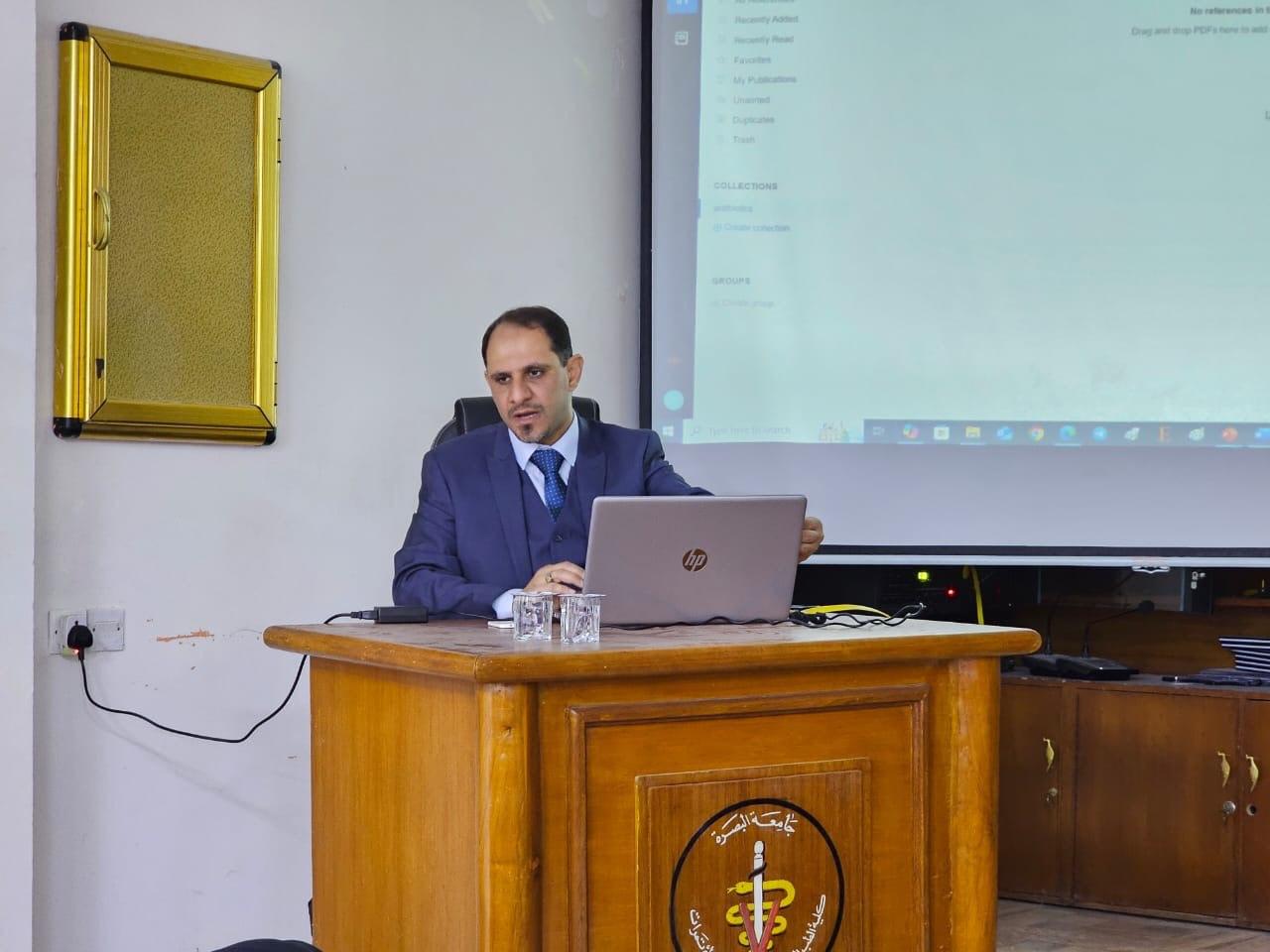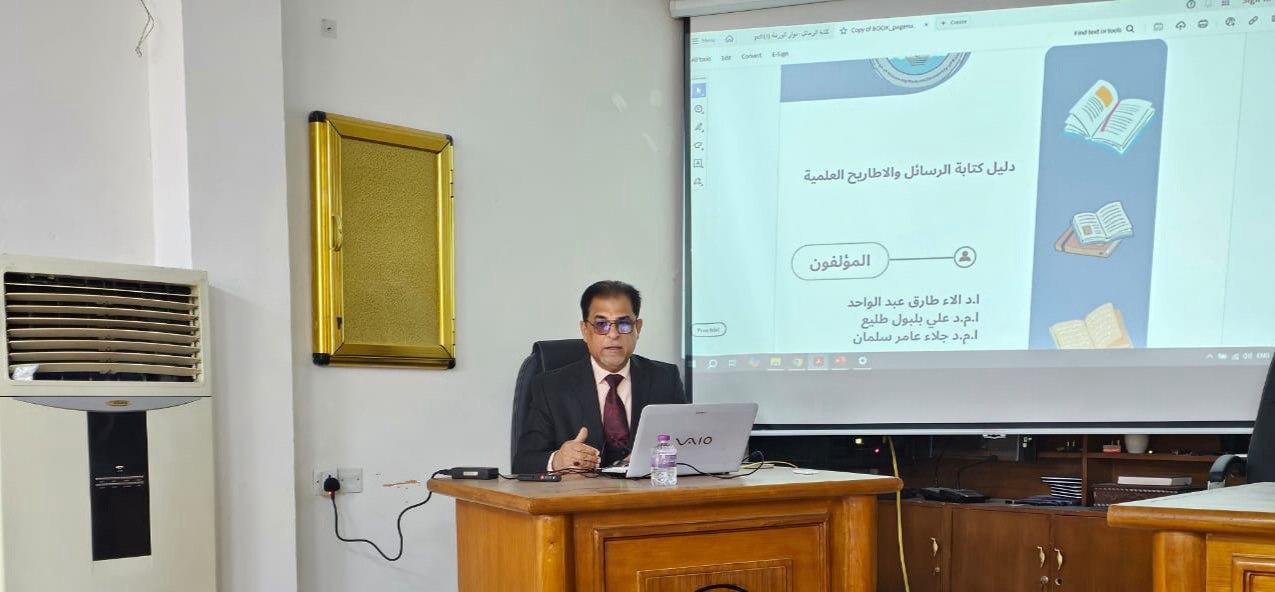 The workshop, presented by Dr. Ali Al-Diwani and Dr. Jalaa Amer, covered how to write theses and dissertations in terms of format, content, and presentation based on specific instructions. It also trained participants on using some modern programs to compile sources within the research methods curriculum for undergraduate and graduate studies, as well as adopting a unified format for writing citations in the Harvard style, which is consistent with well-known programs.