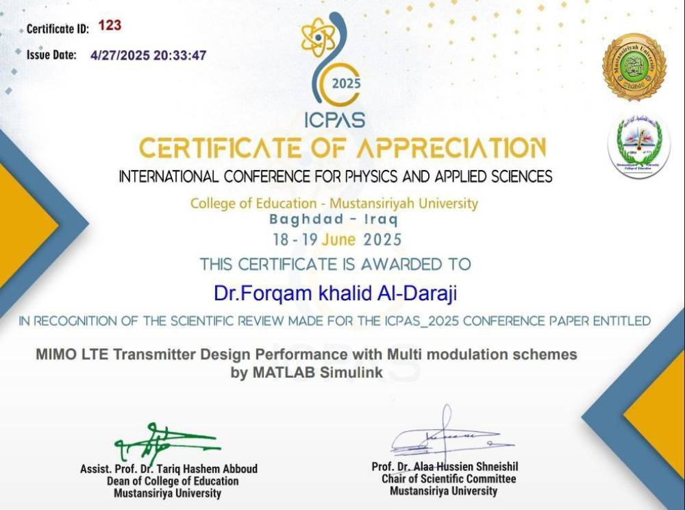 Dr. Furqan Khalid Kashish from the University of Basra receives a certificate of appreciation for evaluating scientific research at an international conference...