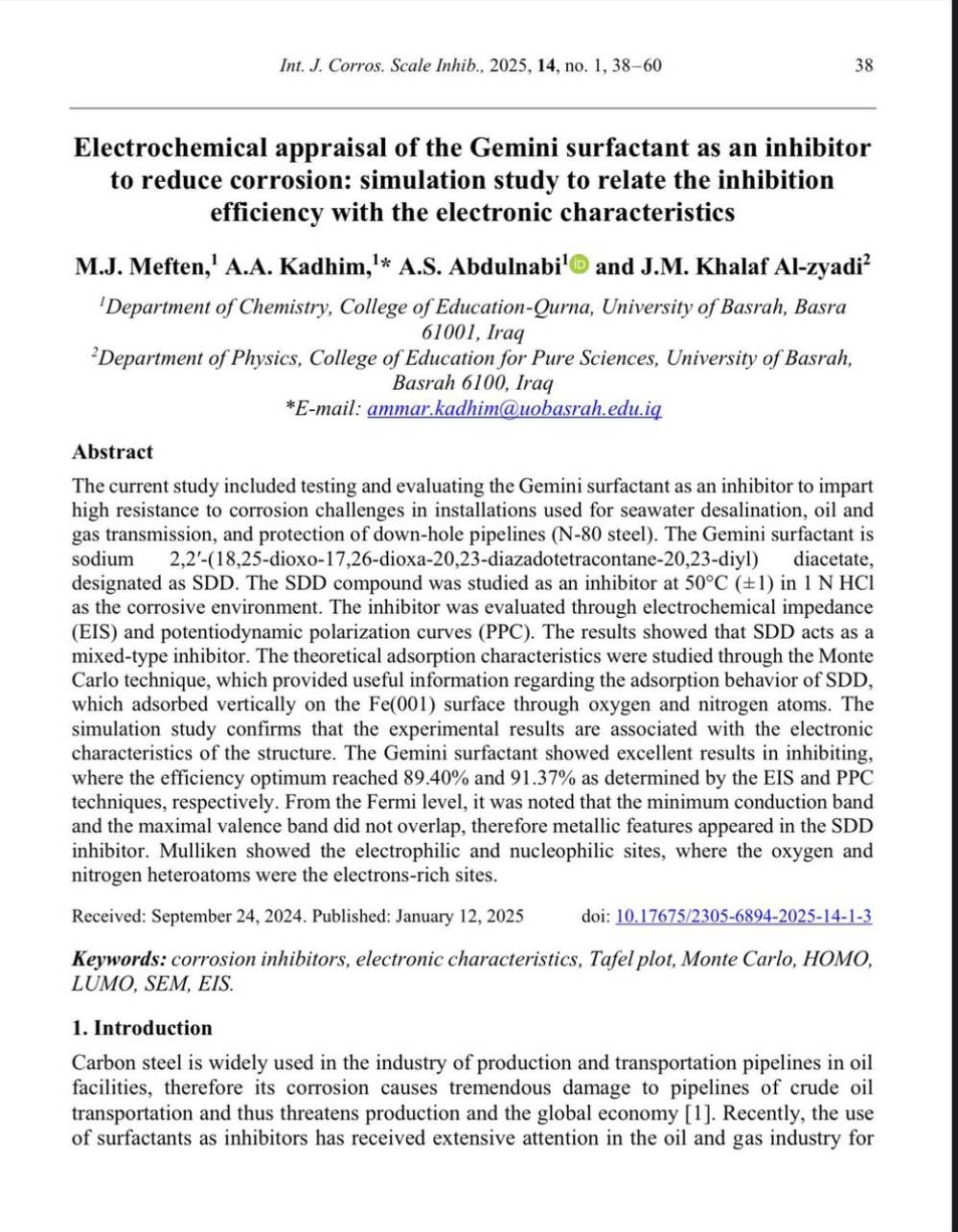 A Scientific Study at the University of Basrah Examines the Electrochemical Evaluation of the Gemini Surfactant...