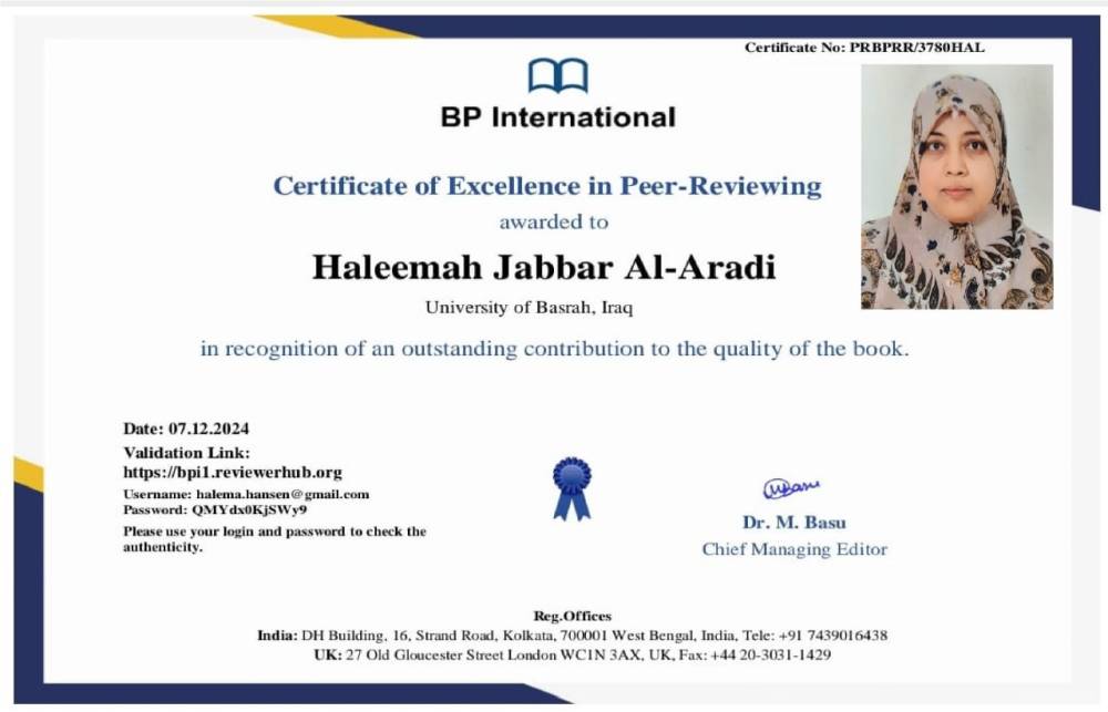 A Lecturer at University of Basrah Selected as a Scientific Reviewer for an Upcoming Book Chapter...